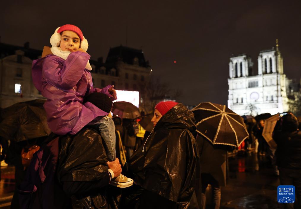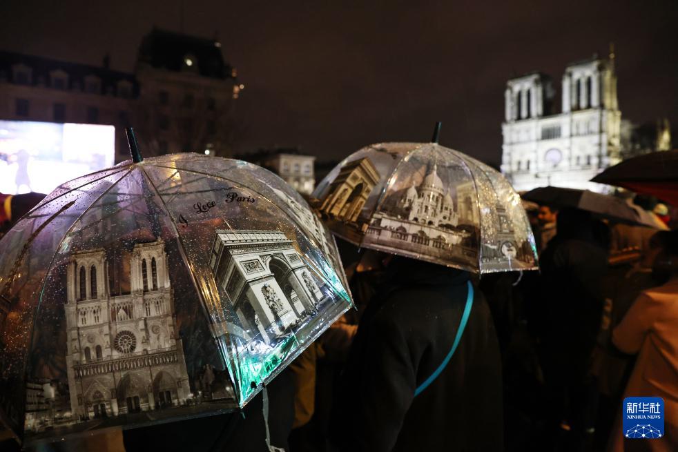 12月7日,人們冒雨聚集在法國巴黎圣母院外。