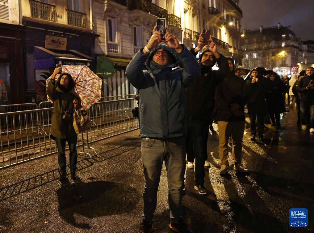 12月7日,人們冒雨聚集在法國巴黎圣母院外,燈光在外墻上打出法語“謝謝”字樣。