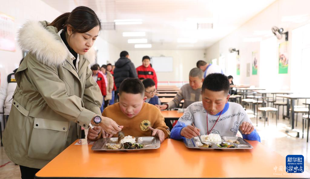 3月1日,午餐時(shí)間,鳳城特殊教育學(xué)校的老師趙閱(左)在食堂照顧學(xué)生吃飯。