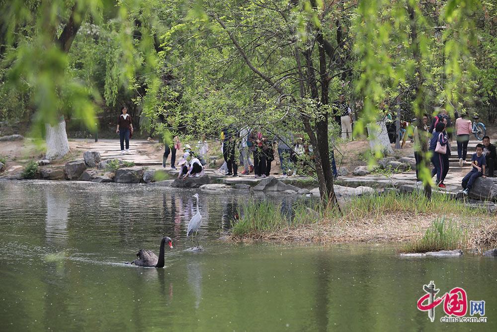 游客在北大未名湖畔被湖中水禽吸引目光。中國(guó)網(wǎng) 趙娜攝影