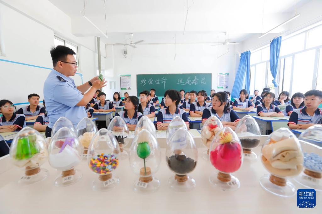 6月25日,在河南省平頂山市寶豐縣第三初級中學(xué),民警利用仿真毒品模型為學(xué)生講解毒品的種類。