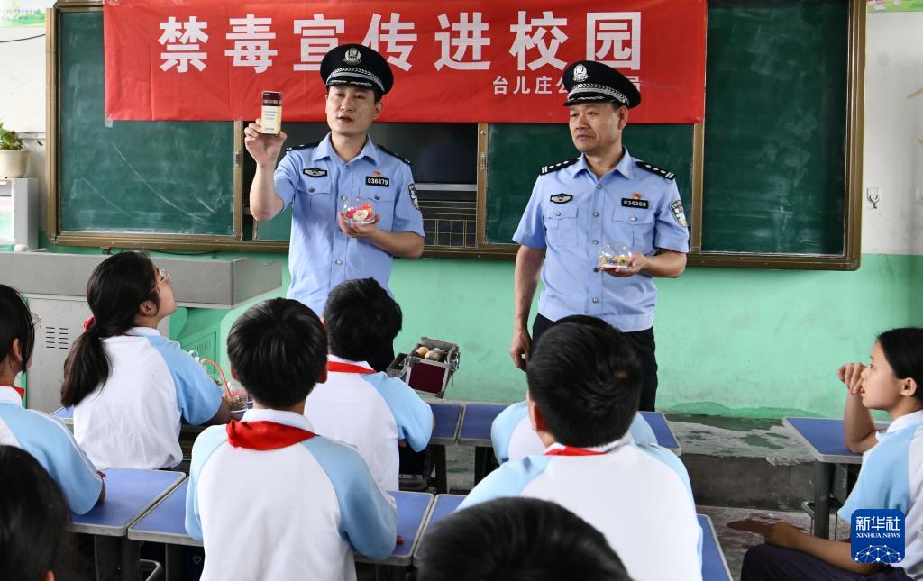 6月25日,在山東省棗莊市臺兒莊區(qū)順河小學(xué),民警開展禁毒宣傳。