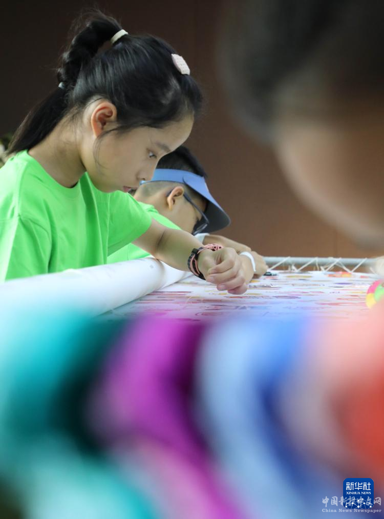 8月16日,小朋友在江蘇蘇州高新區(qū)鎮(zhèn)湖蘇繡小鎮(zhèn)的中國刺繡藝術(shù)館學習體驗刺繡。