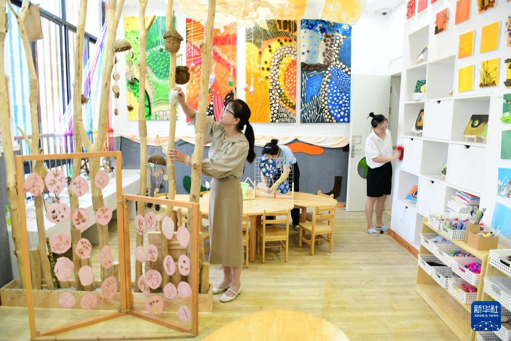 8月27日,山東青島第七實(shí)驗(yàn)幼兒園的員工在做開學(xué)前的清潔美化工作。