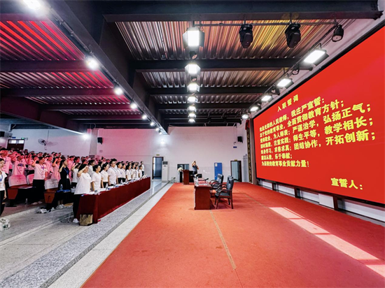 “我是光榮的人民教師,我莊嚴(yán)宣誓:忠于黨的教育事業(yè),全面貫徹教育方針……”上午9時,會場大廳,全體新教師進行了莊嚴(yán)的入職宣誓。通過宣誓讓大家感受到了教師職業(yè)的崇高和神圣,激發(fā)了新教師對教育使命的莊嚴(yán)承諾和對未來工作的堅定決心,力爭做一名優(yōu)秀的人民教師。