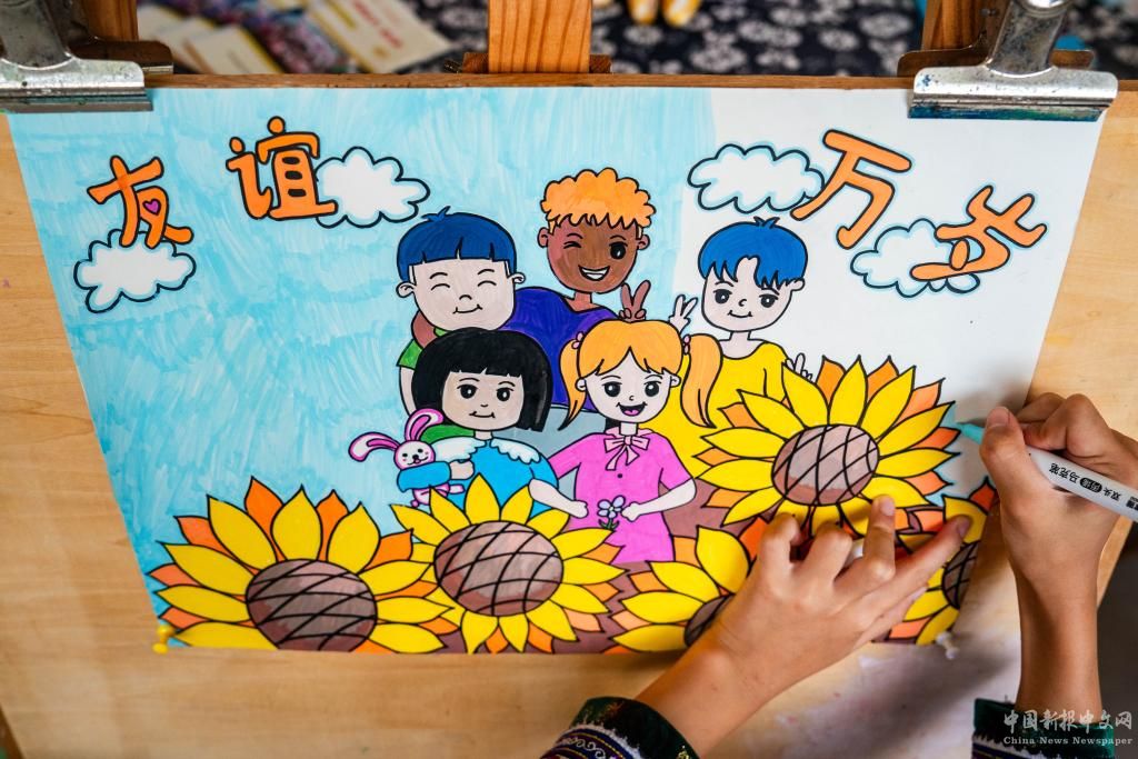 9月2日,在中國(guó)-赤道幾內(nèi)亞友誼小學(xué),一名學(xué)生在創(chuàng)作以中赤幾友誼長(zhǎng)青為主題的繪畫(huà)作品。
