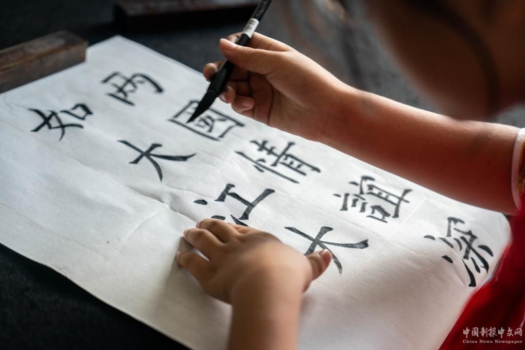 9月2日,在中國(guó)-赤道幾內(nèi)亞友誼小學(xué)書(shū)法教室,一名學(xué)生在創(chuàng)作以中赤幾友誼長(zhǎng)青為主題的書(shū)法作品。