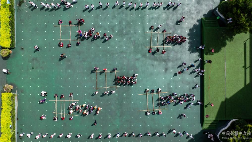 中國(guó)-赤道幾內(nèi)亞友誼小學(xué)的學(xué)生在操場(chǎng)上跳竹竿舞(無(wú)人機(jī)全景照片,9月2日攝)。
