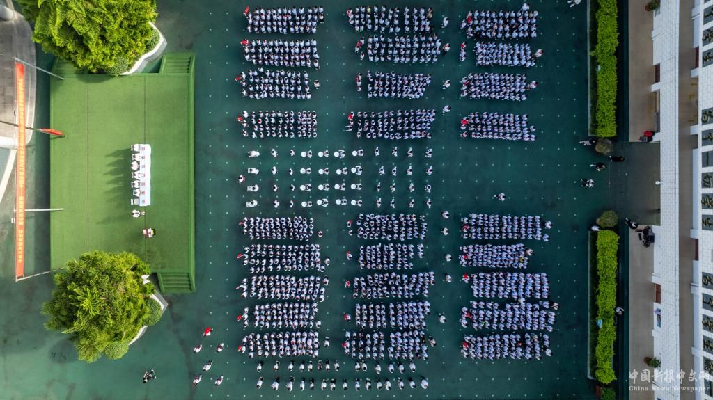 中國(guó)-赤道幾內(nèi)亞友誼小學(xué)的師生在參加開(kāi)學(xué)典禮(無(wú)人機(jī)照片,9月2日攝)。