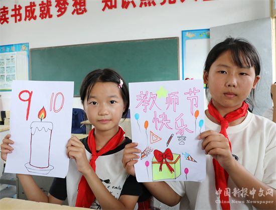 9月6日,在湖南省保靖縣野竹坪小學(xué),學(xué)生給老師送別樣的節(jié)日禮物。教師節(jié)到來之際,該校學(xué)生們手工制作花束、賀卡等特色禮物獻給老師,祝福老師節(jié)日快樂。(俞采華 王夢妮)