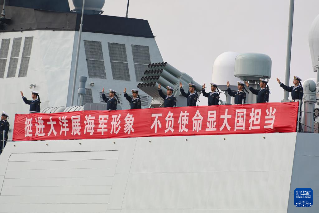 伴隨著嘹亮的軍樂聲,編隊艦艇依次解纜,緩緩駛離碼頭。甲板上,任務官兵整齊列隊,精神抖擻,揮手告別。
