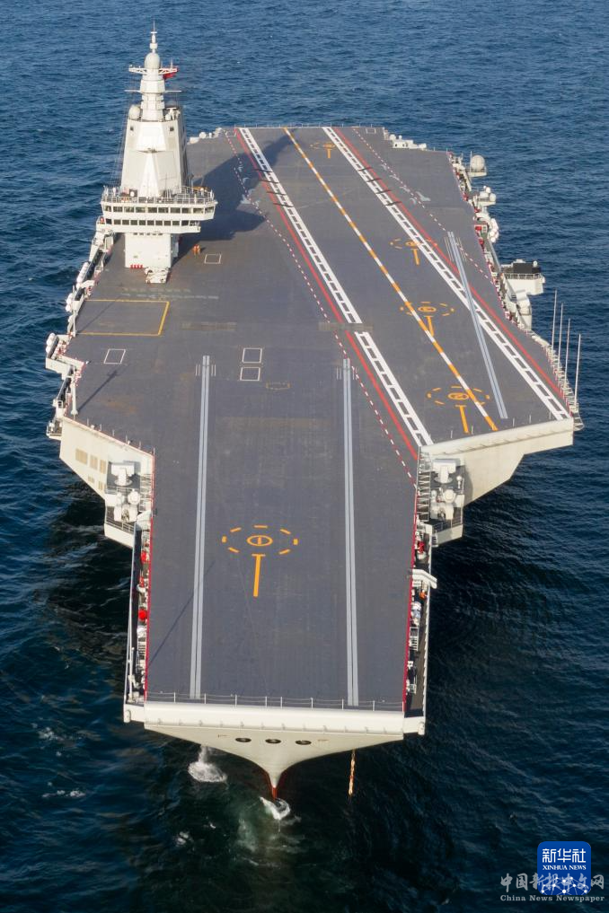 這是首航試驗中的中國海軍福建艦(5月1日攝,無人機照片)。新華社發(fā)(蒲海洋 攝)