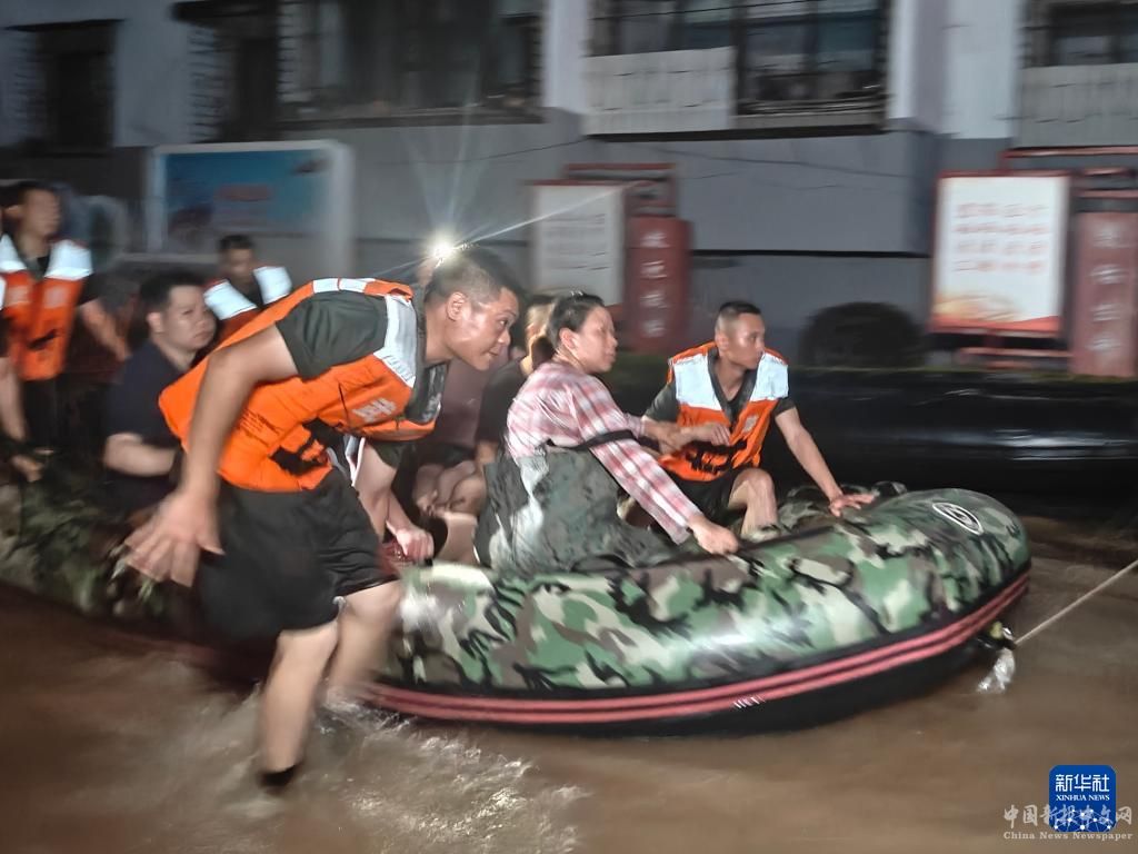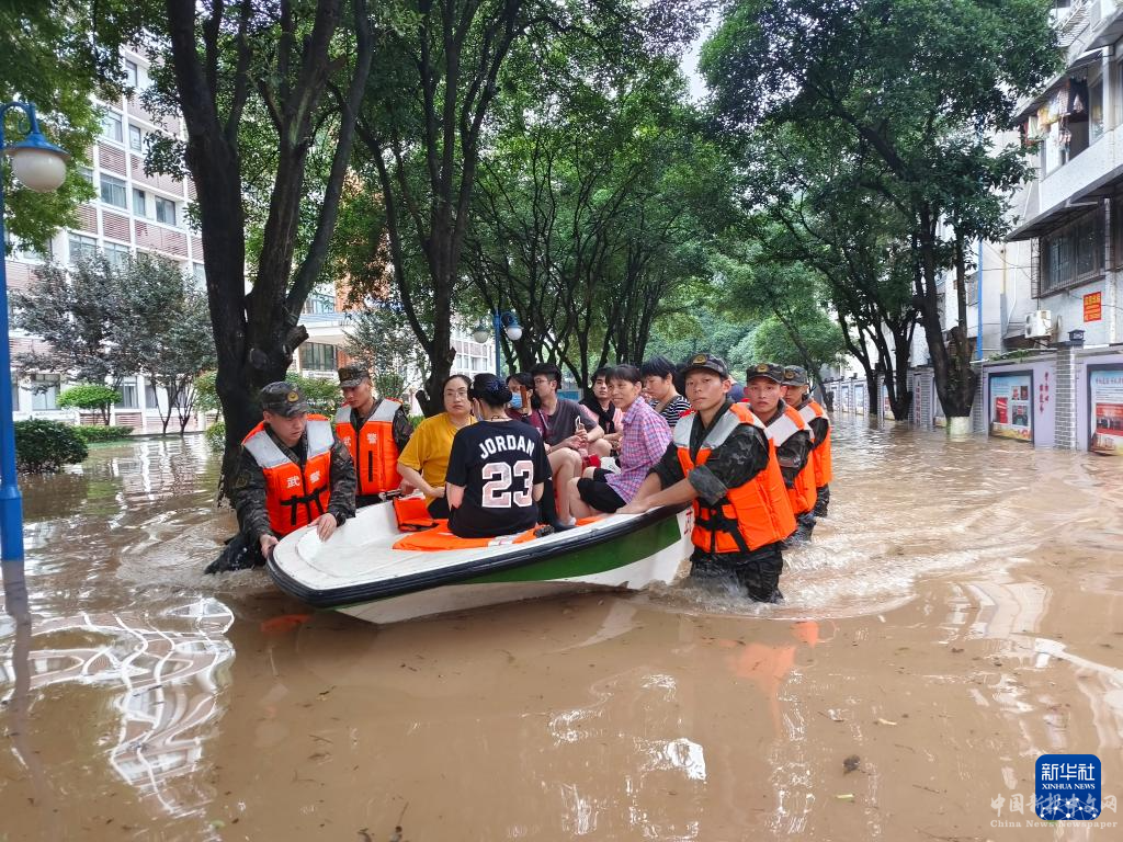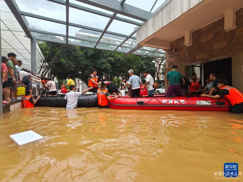 6月19日,武警廣西總隊(duì)桂林支隊(duì)官兵在桂林市秀峰區(qū)九崗嶺小區(qū)用沖鋒舟轉(zhuǎn)移受困群眾。新華社發(fā)(張辰飛 攝)