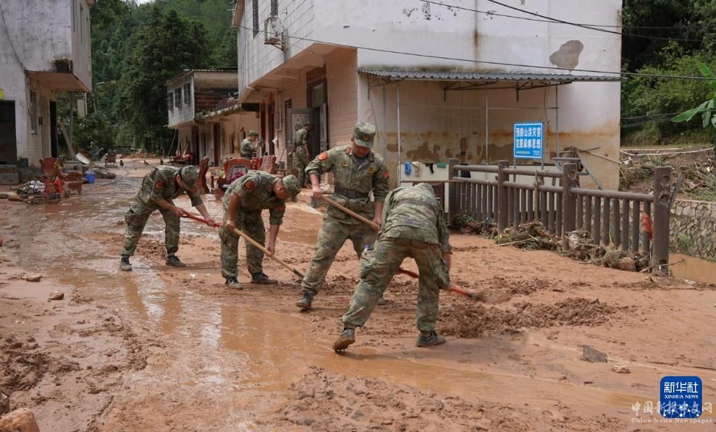 6月19日,廣東省梅州市平遠(yuǎn)縣人武部組織民兵清理災(zāi)區(qū)道路淤泥。新華社發(fā)(曾瑜 攝)