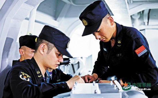 東部戰(zhàn)區(qū)海軍某支隊軍士對裝備進行學(xué)習(xí)研討。溫子?xùn)| 攝