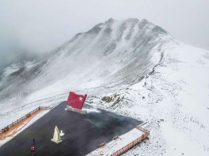 這是位于四川夾金山海拔4114米埡口的紅色主題文化景觀(2021年5月12日攝,無人機(jī)照片)。新華社發(fā)(郝立藝 攝)