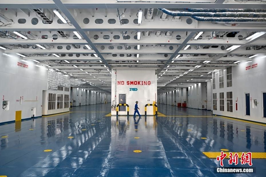 10月24日,中國自主研制的首艘大型出口客滾船——MSC/GNV1500客/3100米車道豪華客滾船“GNV Polaris(GNV·北極星)”號在廣州南沙命名交付。該船是由中國船舶集團旗下廣船國際為全球領先的運輸與物流企業(yè)MSC地中海航運集團旗下客渡輪運營商Grandi Navi Veloci(GNV)量身打造的一艘現(xiàn)代化大型綠色豪華客滾船,由廣船國際設計建造,具備完全自主知識產(chǎn)權,內(nèi)裝材料實現(xiàn)100%國產(chǎn)化,也是中國首艘獲得biosafe生物安全入級符號、首艘應用有機硅防污漆的新造豪華客滾船。圖為“GNV Polaris”號的車道。