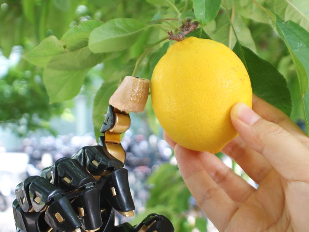 圖為仿生三維電子皮膚在觸摸檸檬感知其軟硬程度。(受訪者供圖)