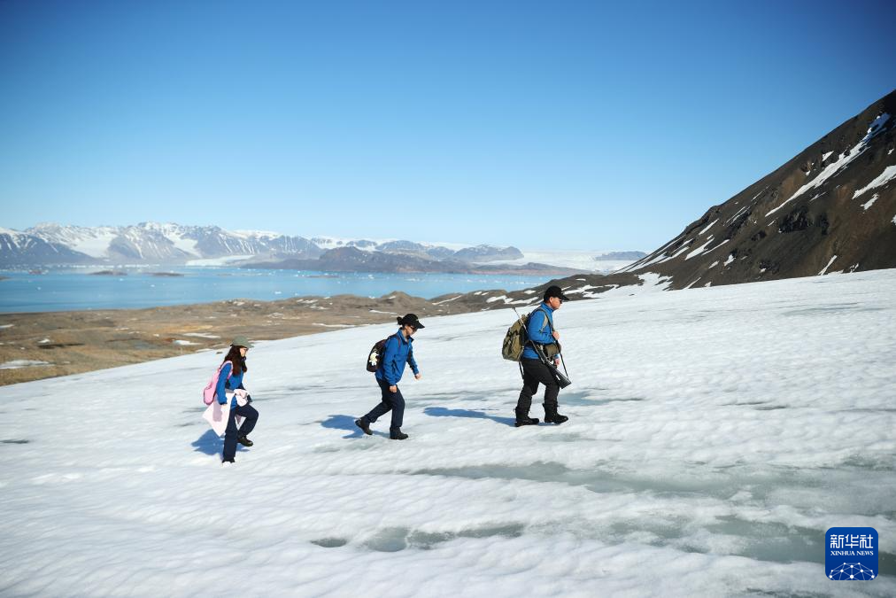 6月22日,在挪威斯瓦爾巴群島,科考隊員徒步前往東洛文冰川采樣點。
