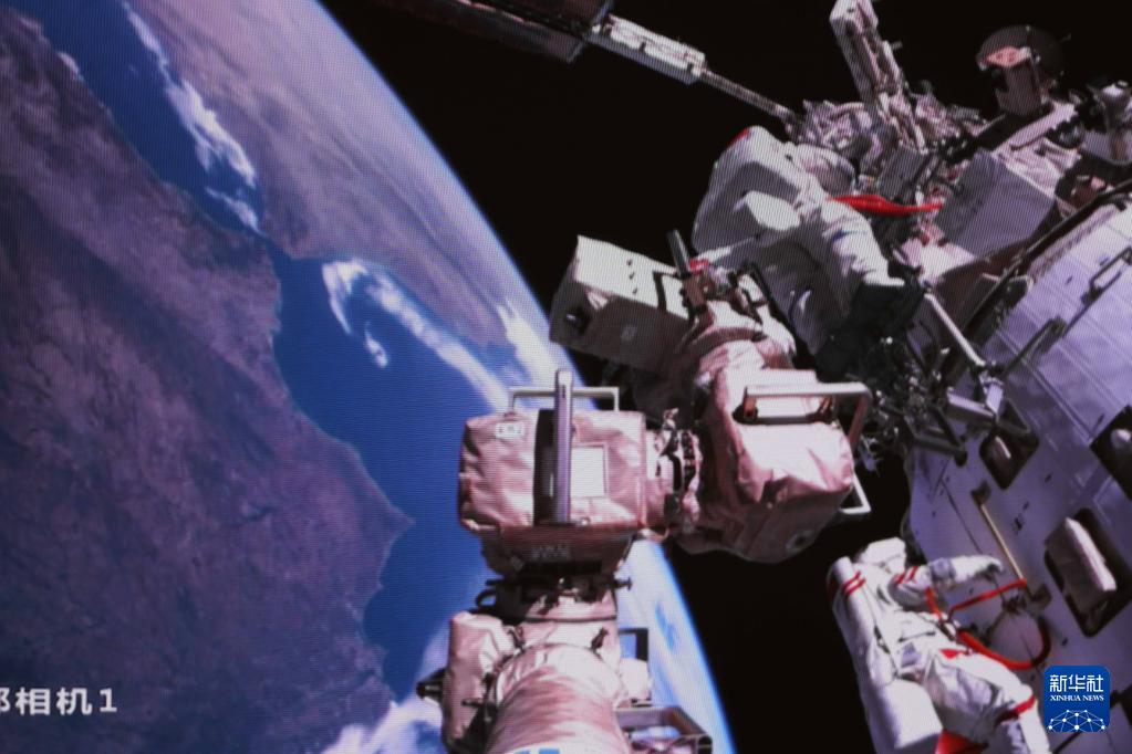 7月3日在北京航天飛行控制中心拍攝的神舟十八號航天員李聰(上)、葉光富(下)在空間站組合體艙外作業(yè)的畫面。