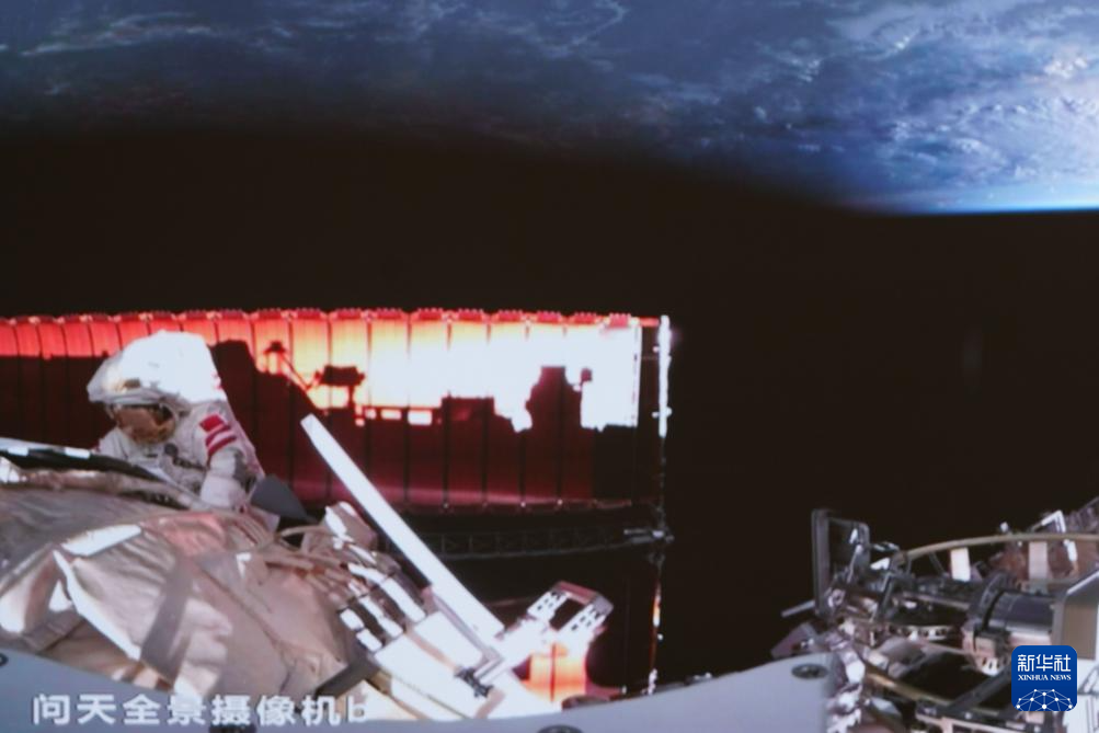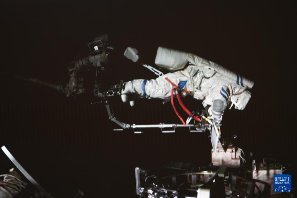 7月3日在北京航天飛行控制中心拍攝的神舟十八號航天員葉光富在空間站組合體艙外作業(yè)的畫面。