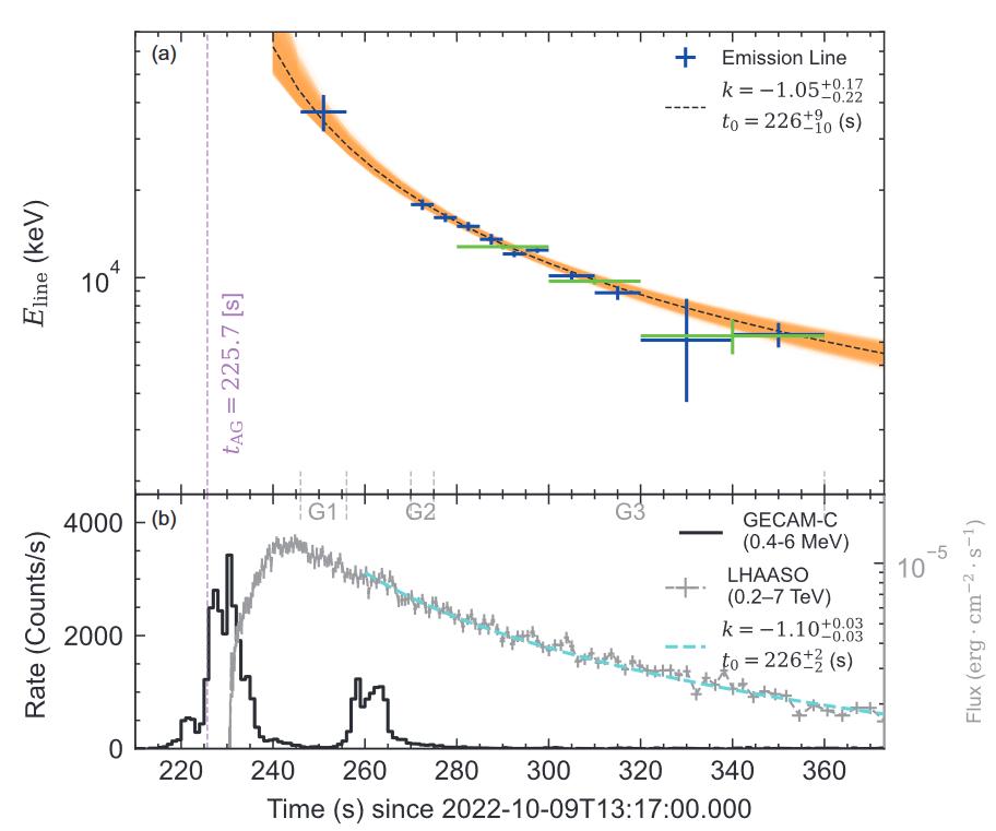 GRB 221009A的譜線能量隨時間以冪律演化。(中國科學院高能物理研究所供圖)
