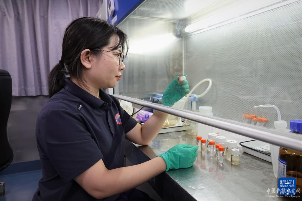 9月11日,科考隊(duì)員張珊對(duì)下潛中采集到的生物樣品進(jìn)行觀察分析。新華社記者 王聿昊 攝