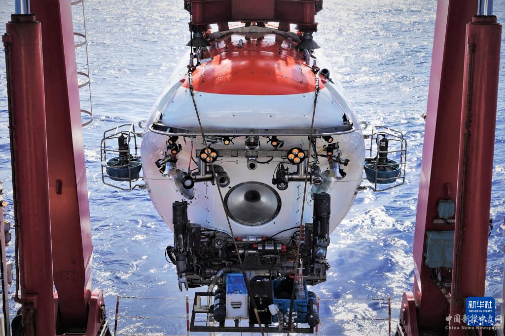 9月11日,“蛟龍?zhí)?rdquo;結(jié)束下潛返回“深海一號(hào)”船后甲板。新華社記者 王聿昊 攝