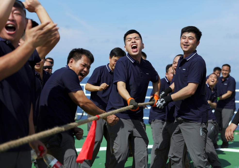 這是考察隊隊員在“雪龍2”號上參加拔河活動。