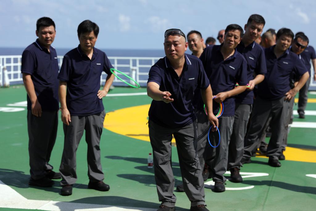 這是考察隊隊員在“雪龍2”號上參加趣味套圈活動。