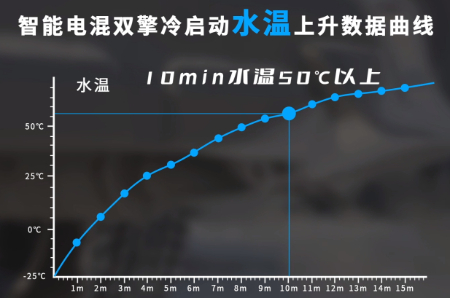 低溫冷啟動(dòng)依靠發(fā)動(dòng)機(jī)性能,需要在合適的溫度、潤(rùn)滑條件下才可以啟動(dòng)成功,并實(shí)現(xiàn)經(jīng)濟(jì)的性能表現(xiàn),兩輛車在極寒環(huán)境里,發(fā)動(dòng)機(jī)怠速工作,油溫升到0攝氏度以上,僅需約4min,以較快的速度進(jìn)入了高效潤(rùn)滑區(qū)間,使車輛啟動(dòng)瞬間響應(yīng),同時(shí)也為實(shí)現(xiàn)低溫低能耗打下了技術(shù)基礎(chǔ)。 怠速不到10分鐘,水溫即可升到接近50℃,在當(dāng)?shù)剡@種極寒環(huán)境下,相較常規(guī)燃油車暖車10min-15min的暖車時(shí)間表現(xiàn),可以說(shuō)表現(xiàn)良好。