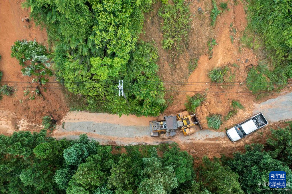 6月17日,工作人員駕駛機(jī)械在貴州省黔東南苗族侗族自治州從江縣下江鎮(zhèn)松隴村清理進(jìn)村道路(無人機(jī)照片)。