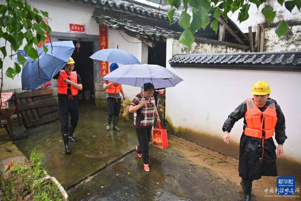 6月17日,福建省建甌市川石鄉(xiāng)慈口村防汛人員協(xié)助低洼地帶村民轉(zhuǎn)移。