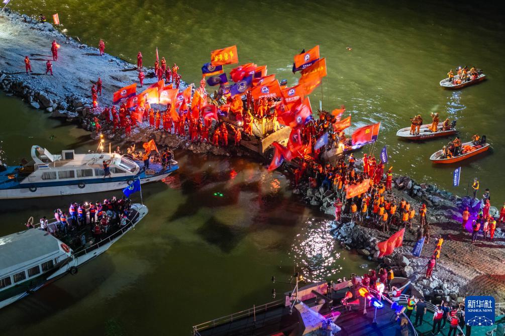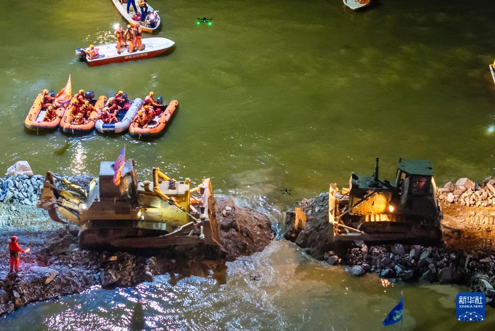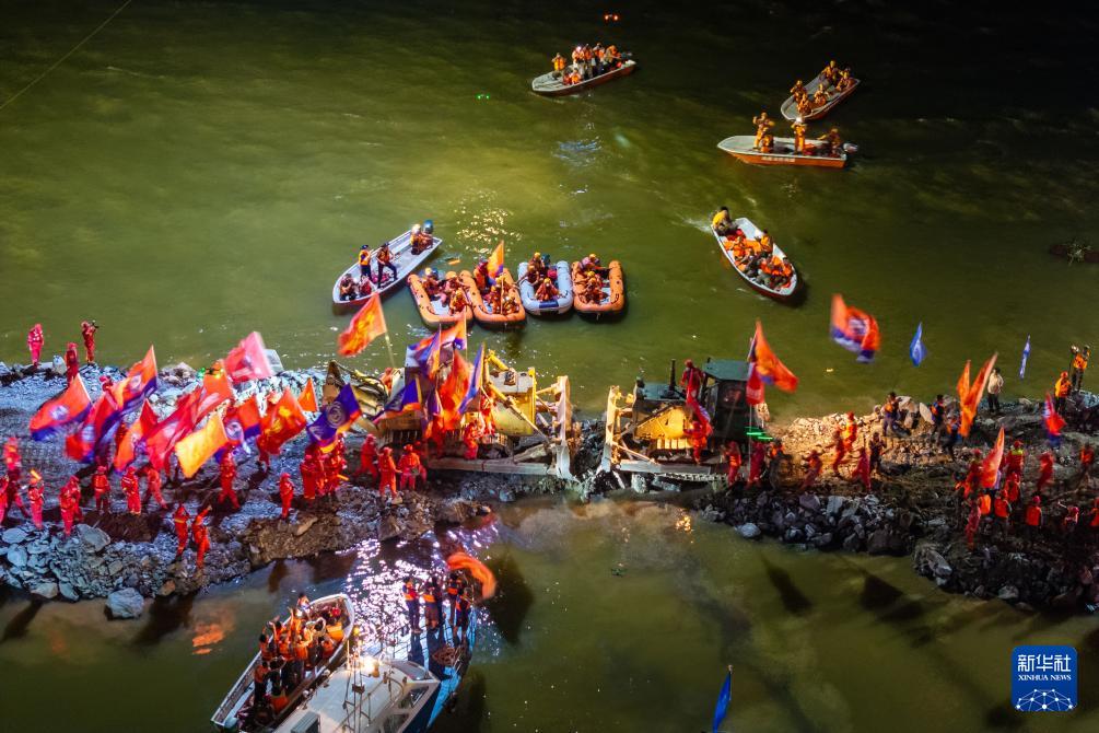 這是7月8日晚拍攝的團(tuán)洲垸洞庭湖大堤決口封堵現(xiàn)場(無人機(jī)照片)。