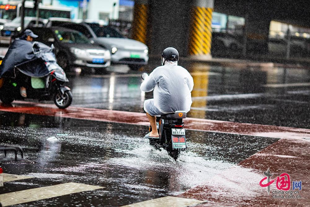 7月30日,外賣員在早高峰時(shí)段冒雨出行。中國(guó)網(wǎng)記者 鄭亮攝