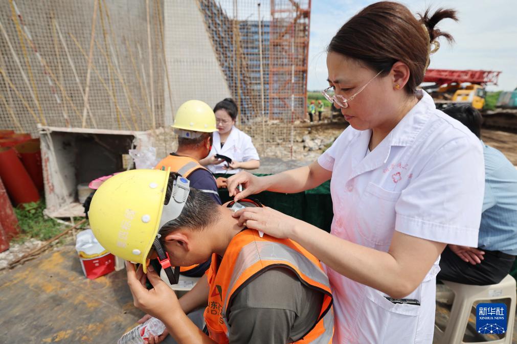 8月6日,在山東省臨沂市沂南縣銅井鎮(zhèn)董梁高速第四標(biāo)段施工現(xiàn)場,醫(yī)務(wù)工作者給工人貼防暑貼。
