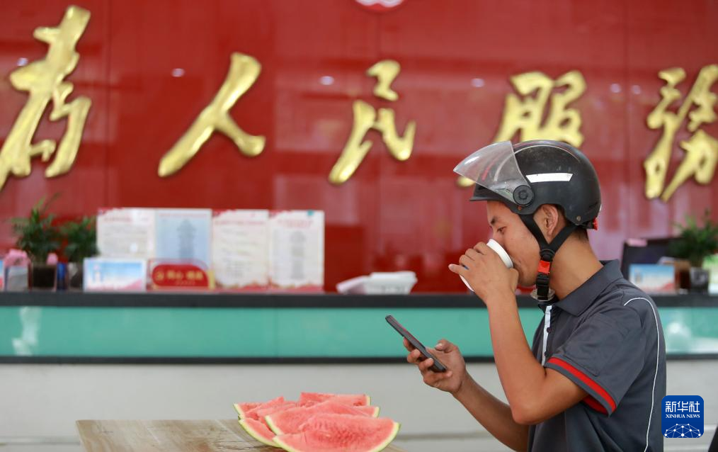8月6日,快遞小哥在河北省承德市寬城滿族自治縣缸窯溝社區(qū)服務(wù)站吃西瓜。