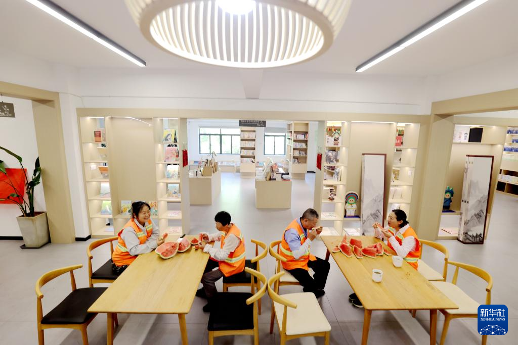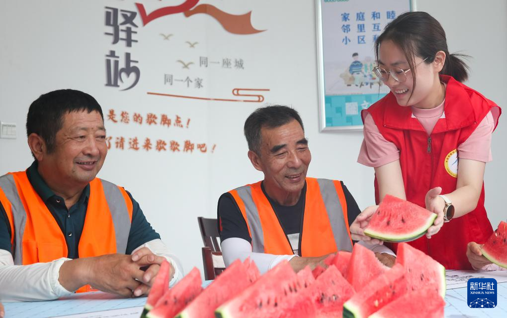 8月6日,在江蘇省鎮(zhèn)江句容市崇明街道梅花社區(qū)一處愛心驛站,志愿者為社區(qū)保潔員送上西瓜。
