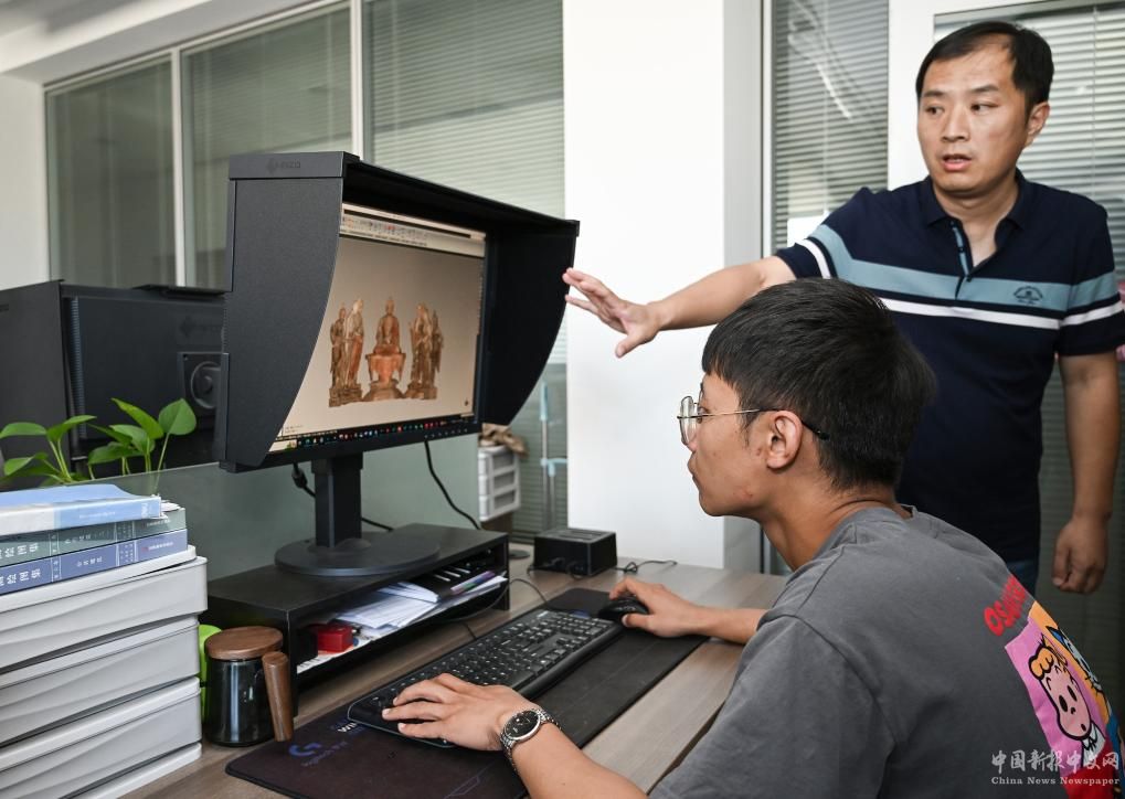 敦煌研究院文物數(shù)字化研究所,工作人員展示莫高窟彩塑三維重建后的成果。新華社記者 李賀 攝