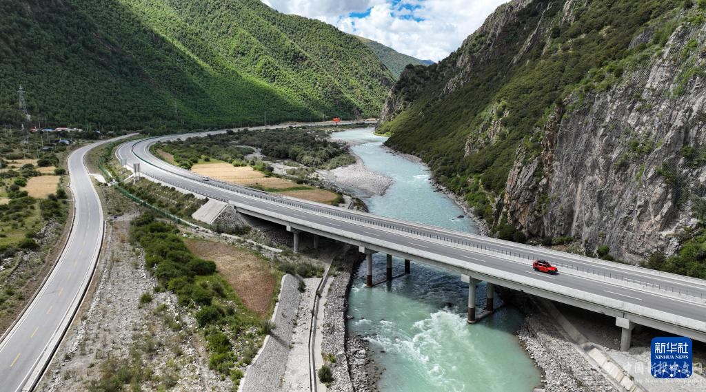 橫跨在西藏林芝市境內(nèi)尼洋河上的林芝至拉薩高等級(高速)公路(9月5日攝,無人機照片)。