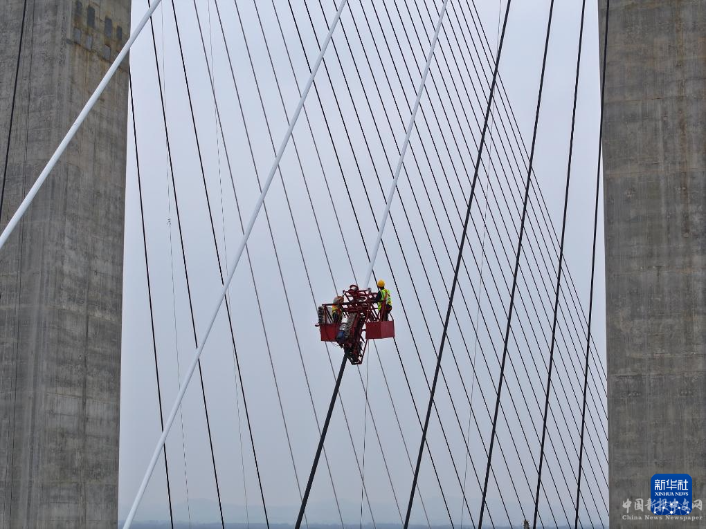 9月16日,湖北襄陽207國道改建項目隆中大橋施工現(xiàn)場,中交二航局施工人員在為斜拉索安裝纏包帶。