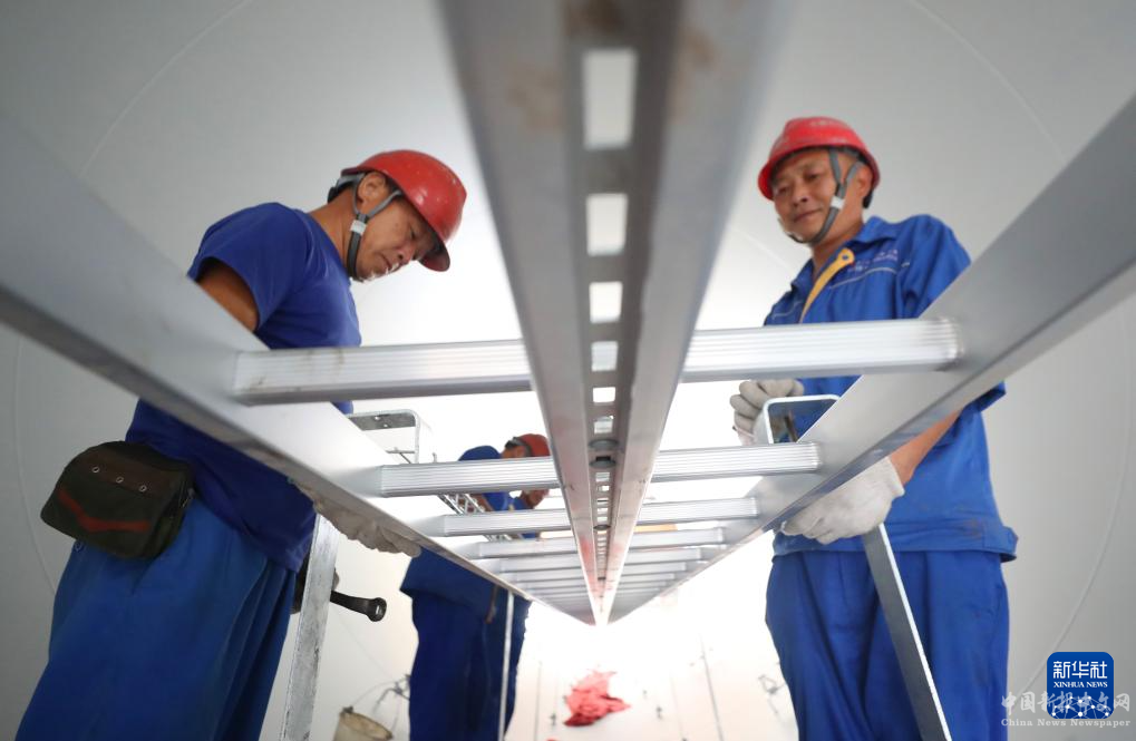 9月16日,在湖南省衡山縣高新技術(shù)產(chǎn)業(yè)開發(fā)區(qū),恒岳重鋼鋼結(jié)構(gòu)工程有限公司的員工在進行風(fēng)電塔筒裝備的外附件安裝作業(yè)。
