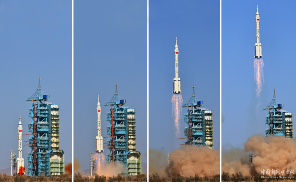 這是神舟十七號載人飛船發(fā)射升空過程(拼版照片,2023年10月26日攝)。新華社記者 李剛 攝