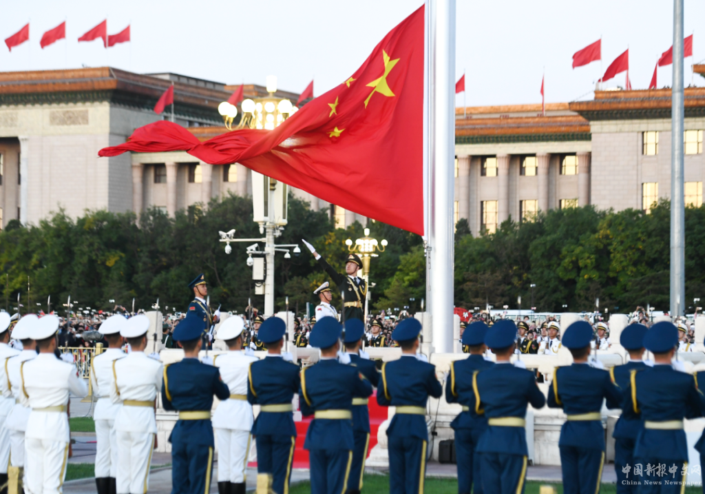 2023年10月1日清晨,隆重的升國旗儀式在北京天安門廣場舉行,慶祝中華人民共和國成立74周年。新華社記者 張晨霖 攝