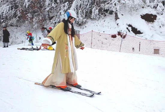 漢服愛好者馬佳在石柱土家族自治縣冷水鎮(zhèn)國際滑雪場滑雪。新華社記者谷訓(xùn) 攝