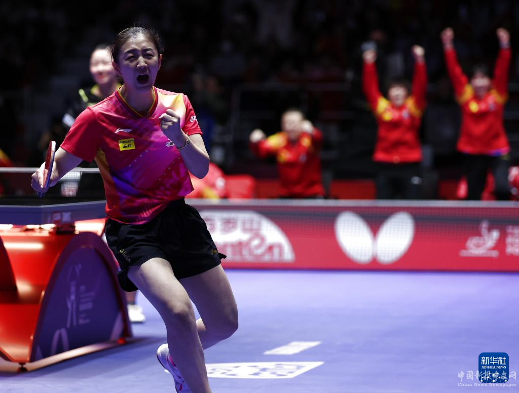 2月24日,中國隊選手陳夢慶祝第五盤比賽獲勝。最終,她3比1戰(zhàn)勝日本隊選手張本美和。