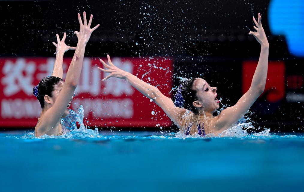 4月7日,中國組合林彥含/徐匯妍(右)在比賽中。當(dāng)日,在國家游泳中心“水立方”舉行的2024年花樣游泳世界杯(北京站)女子雙人自由自選比賽中,中國組合林彥含/徐匯妍以221.0156分的成績獲得亞軍。新華社記者 夏一方 攝