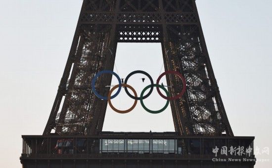 這是6月7日清晨在法國巴黎拍攝的懸掛奧運(yùn)五環(huán)標(biāo)志的埃菲爾鐵塔。新華社記者 高靜 攝