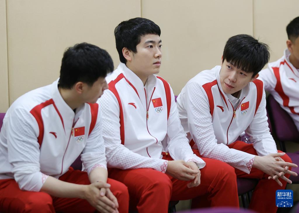 這是中國體育代表團成員馬龍、梁靖崑和王楚欽(從左至右)在大會前。