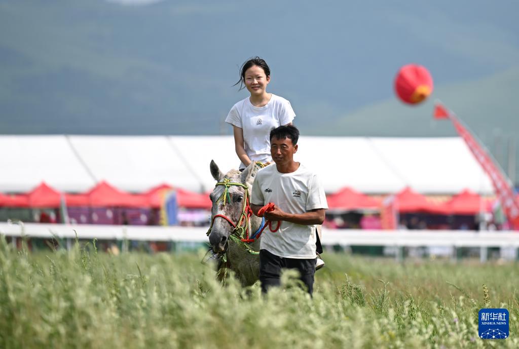 7月17日,游客(后)在烏蘭毛都蘇木民族體育綜合訓(xùn)練基地體驗(yàn)騎馬。